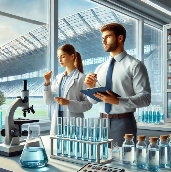 Staff members testing the quality of treated water in a stadium laboratory